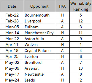 During the FA Cup hiatus, the Under The Hammers supercomputer, Deep Block, has been analysing the thousands of possible permutations and scenarios for the remaining league games. It concluded that the answer to the ultimate question of life, the universe and points needed to guarantee Premier League survival is 42. A target that would require West Ham to pick up 18 points from the upcoming 12 games. That’s a minimum of 5 wins and a handful of draws. Not impossible but still a huge change of fortune for a team that has won just 30 of their last 100 league games, while averaging 1.15 points per game. Repeating such form would take us only to 38 points which may well not be enough. Below is my own winnability ranking of the 12 games to go.