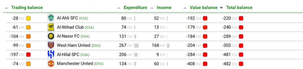 In the survey, which includes all clubs whose transfer spending exceeded €10 million, the two Premier League clubs are joined in the roll of dishonour by four Saudi clubs. And let’s face it, those Saudis are well used to losing an arm and a leg.